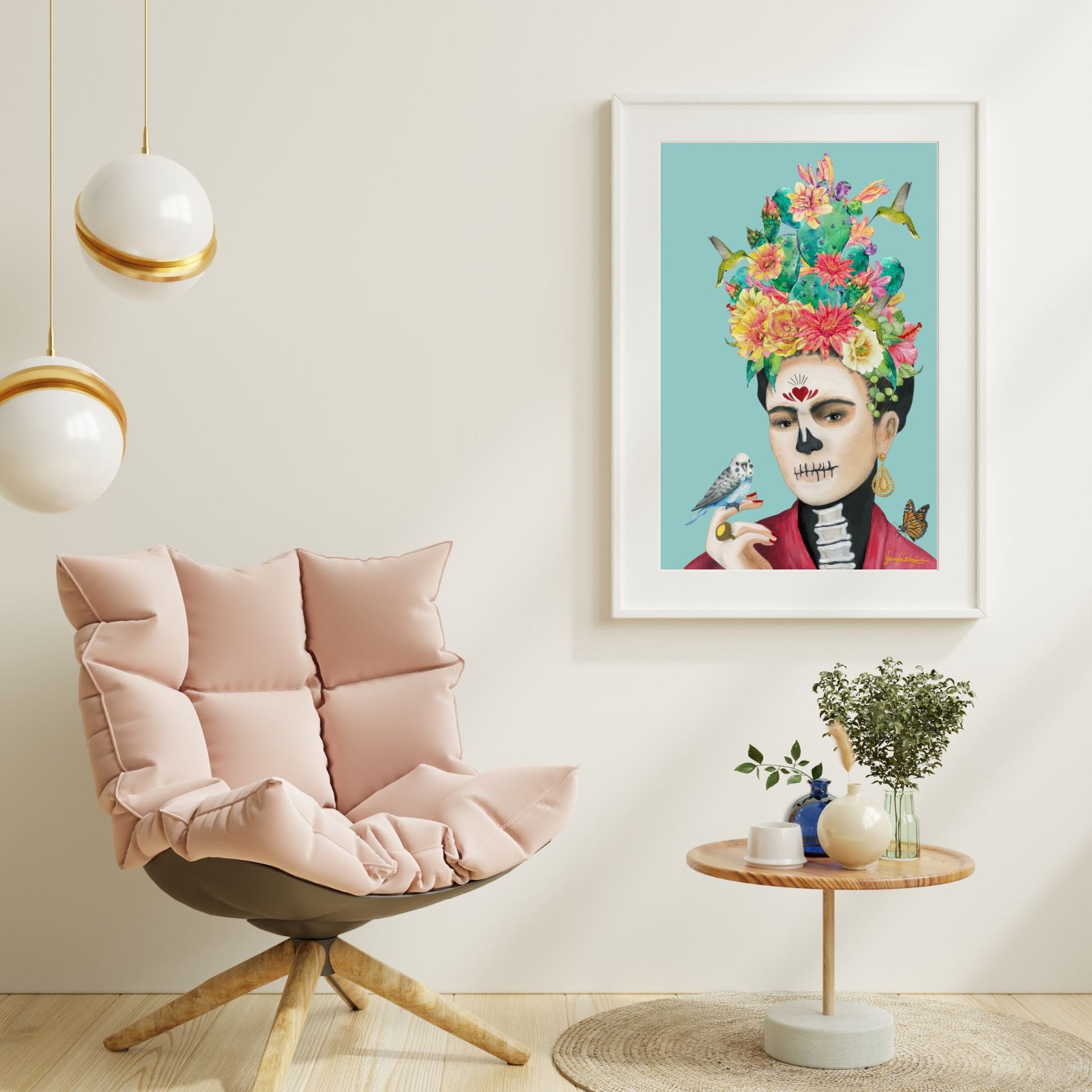 “What didn't you do to bury me but you forgot that I was a seed.” (by Dinos Christianopoulos, Greek poet and scholar.) was the inspiration. When I first read that, it touched me deeply. I was a teenager at the time. I have heard many different variations of it over the years, and this is my own. It came to me again as I was creating this piece, this version of my Frida as a Catrina but without her cigarette. This version, her hand is a perch for her budgie parakeet. The circle of life in full bloom. Accepting death as a human condition but living life from the POV of Spirit; eternal love.